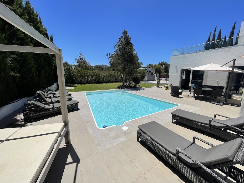 The villa sits on a walled plot of 1000m2 and has a smart terrace running the full length of the property with a child friendly private pool that leads to the grassed garden with in built sprinkler system.
